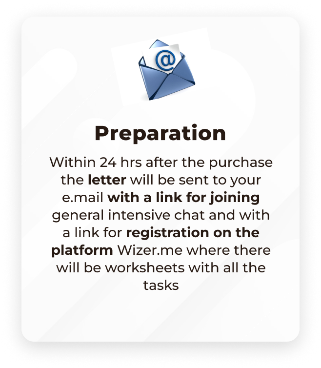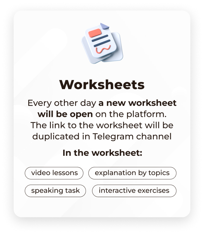 The lessons are conducted on the closed educational platform - Wizer.me. You receive the link for access within 24 hours after payment. An access to a new worksheet is open a day later. Our curators check the tasks and give their feedback within 48 hours. You will also be able to ask questions in Telegram chat below the topic of the lesson post.